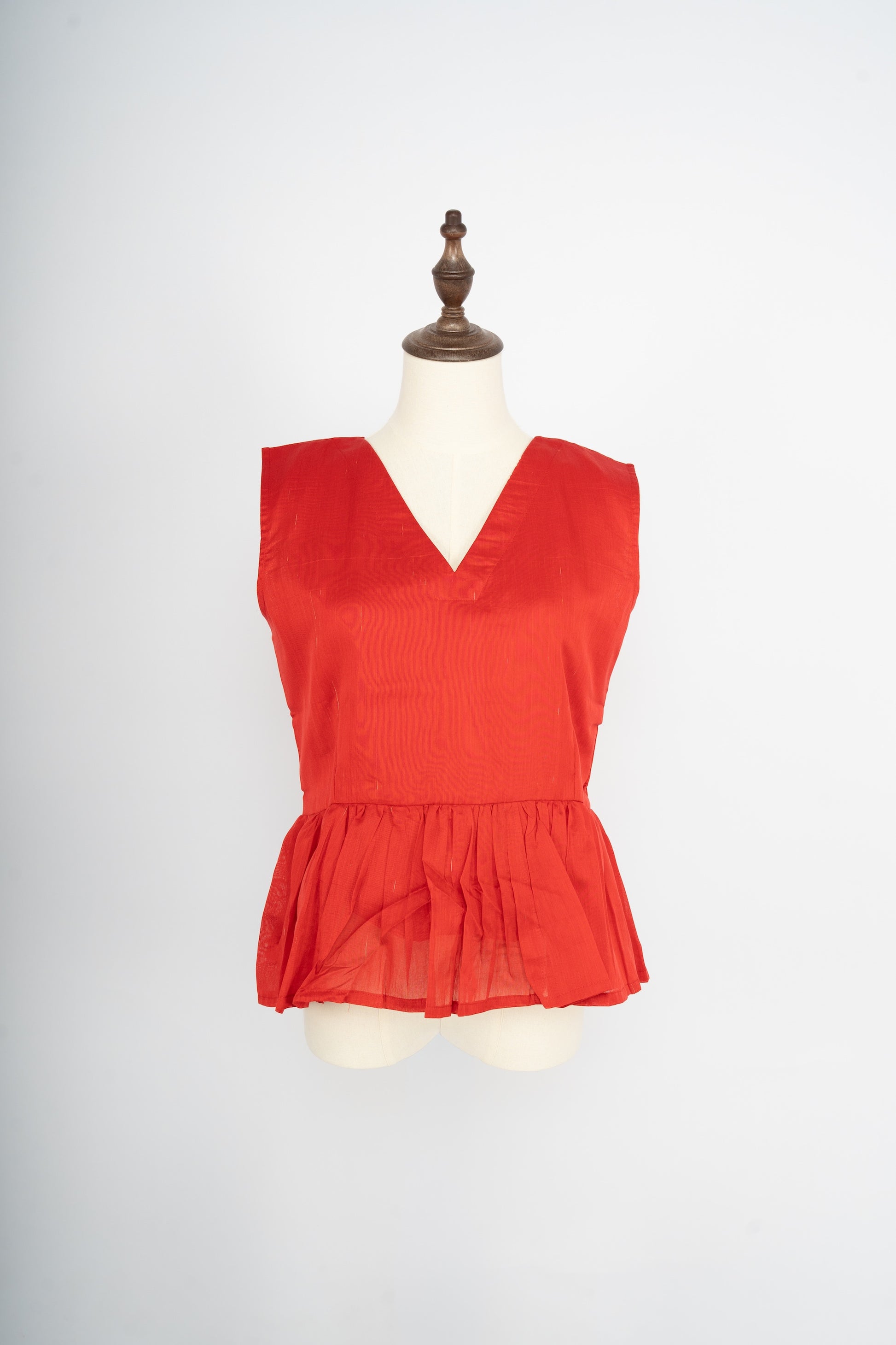Tailored from an upcycled saree, this peplum showcases a vibrant coral red hue with a subtle jacquard texture that adds depth and refinement. A statement in simplicity, perfect for both festive and everyday wear.