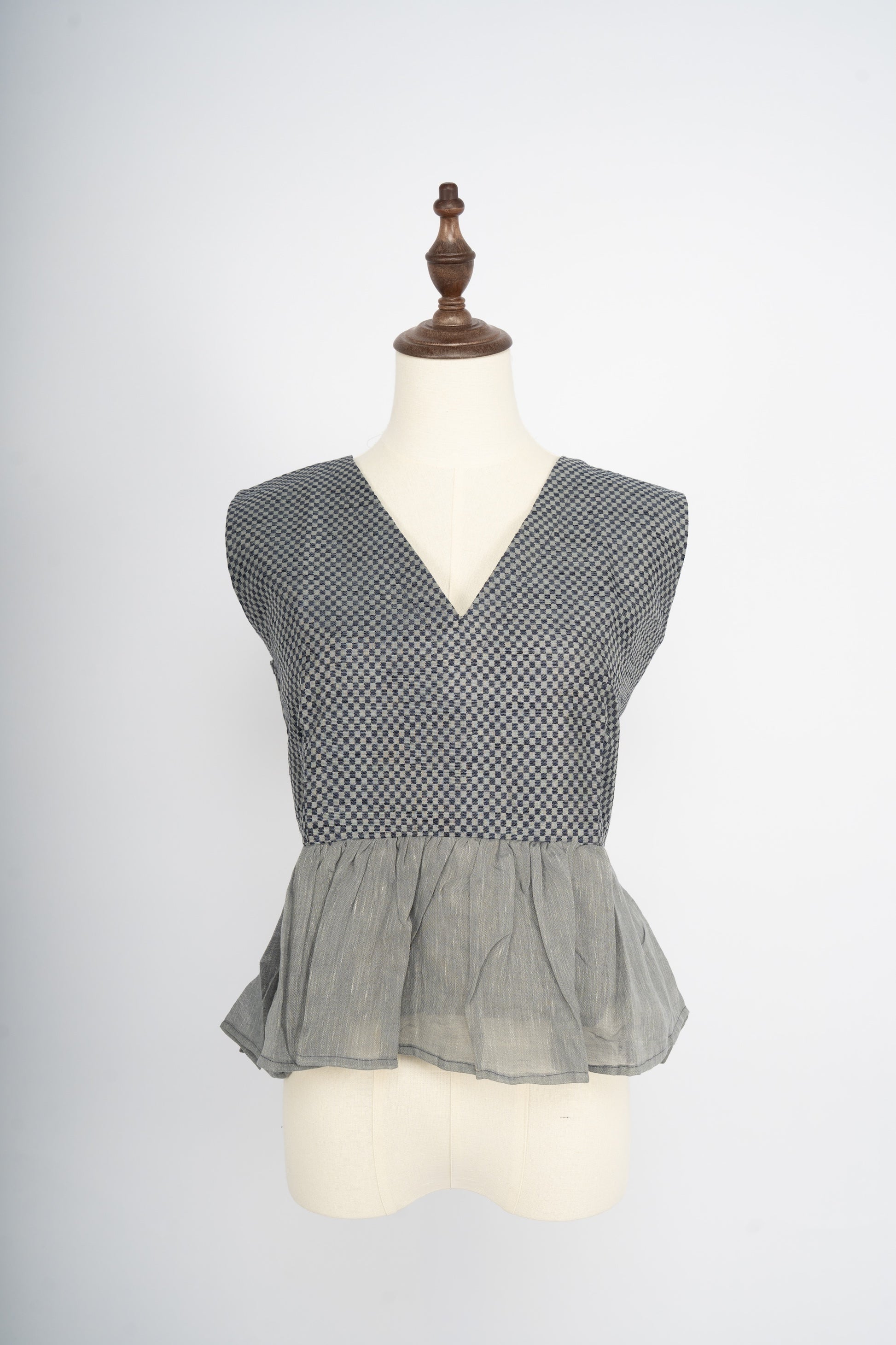 Crafted from an upcycled silk-cotton saree, this peplum features a silver-grey base with a navy checkered weave on the bodice and a solid grey pleated hem. Contemporary and polished, it offers a refined twist on everyday elegance.