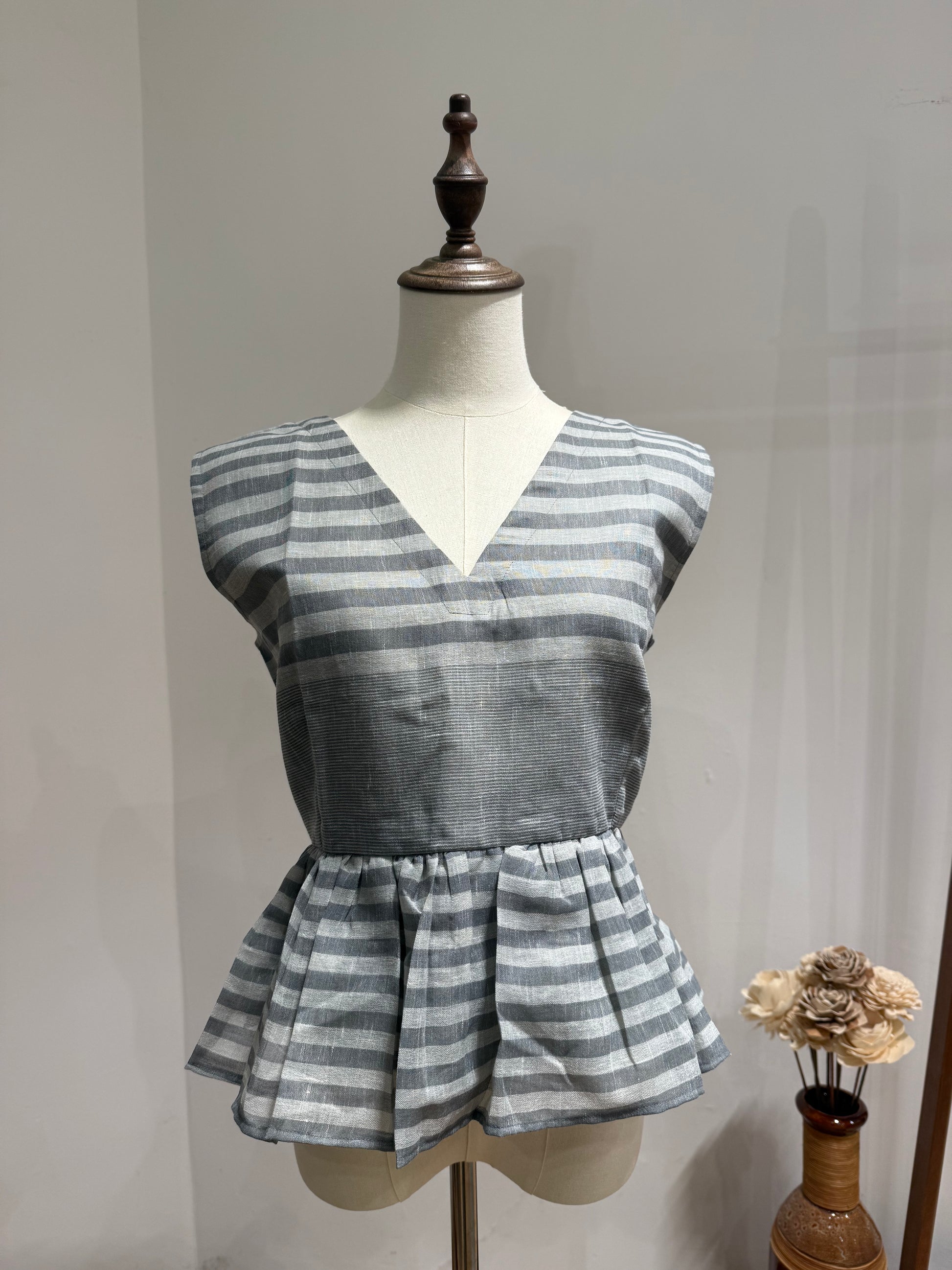 Tailored from an upcycled handwoven silk-cotton saree, this peplum features a silver-grey base accentuated with fine woven stripes. Effortlessly versatile and flattering, it’s a timeless piece that pairs easily with both festive and casual looks.