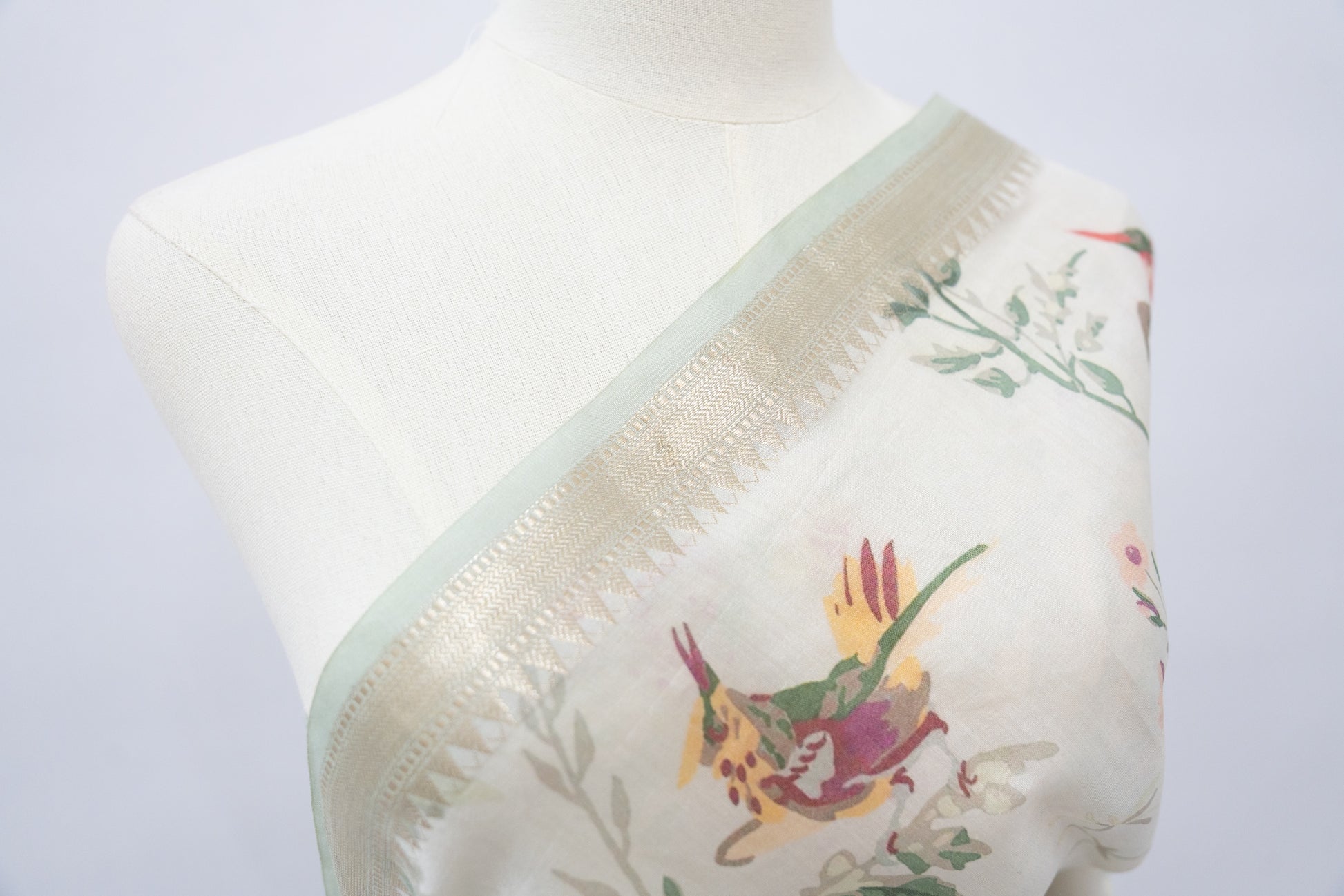 Delicate and ethereal, the Ivory Garden Tussar Silk Saree features a soft cream base adorned with hand-painted-style florals and perched bird motifs in gentle pastel hues. The mint-green border with intricate gold zari detailing adds a subtle contrast, blending traditional artistry with modern grace.