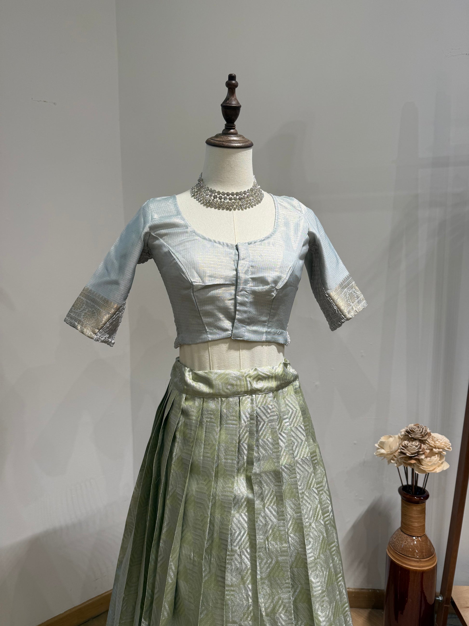 Elegant, versatile, and effortlessly chic — the Ivory Mist Stretchable Saree Blouse is designed to pair seamlessly with both traditional and contemporary sarees. Crafted in a soft metallic silver-blue fabric with a subtle sheen, it features intricate woven borders on the sleeves for a refined finish.