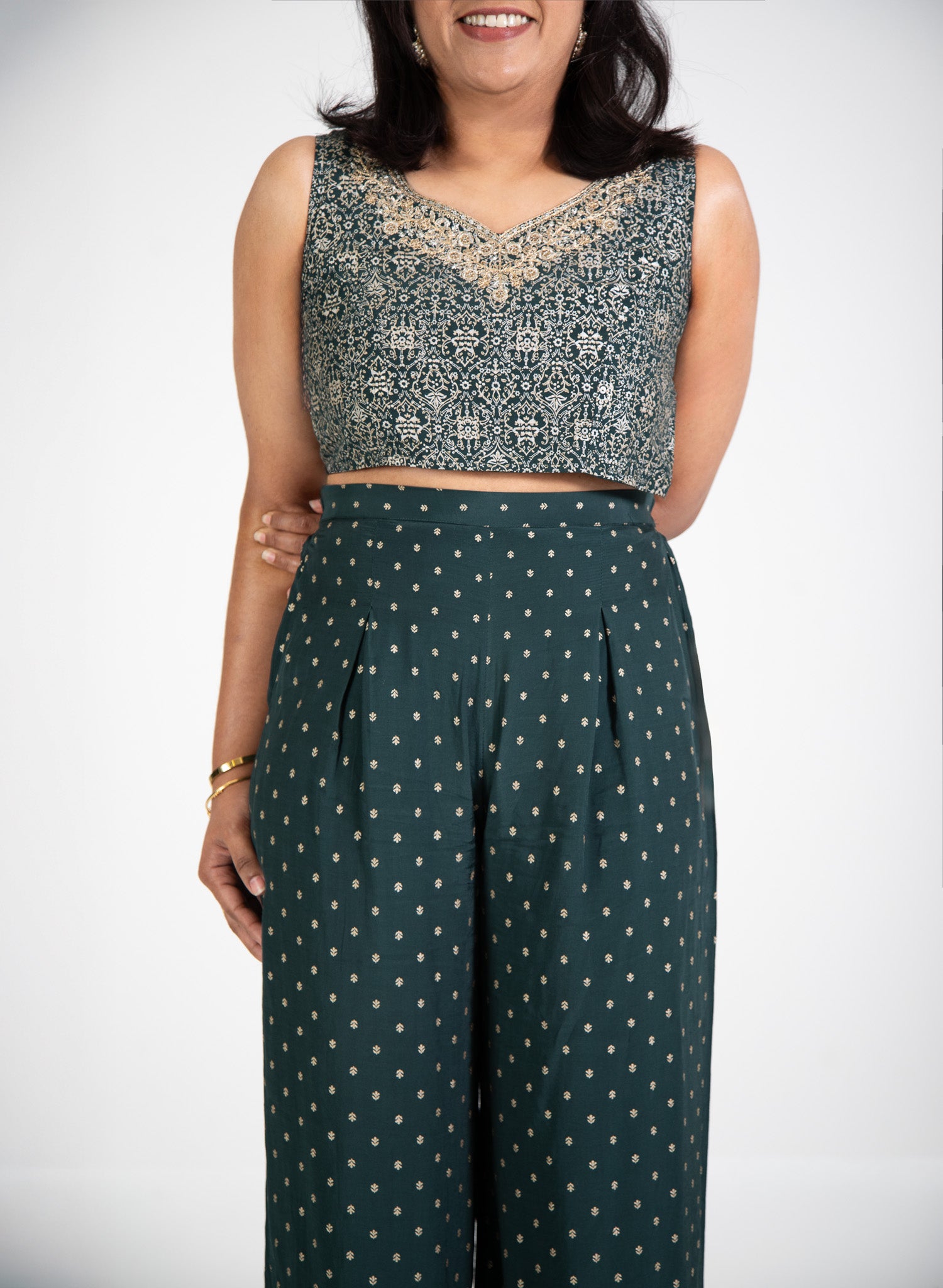 Step into celebration mode with this Oxford Green Embroidered Shrug Set, a contemporary silhouette rooted in festive charm. The set features a detailed embroidered crop top with a scalloped neckline, paired with full-length rayon palazzos in a delicate gold foil print. Layered with a sheer shrug with ¾ embroidered sleeves, this outfit strikes the perfect balance between elegance and ease.